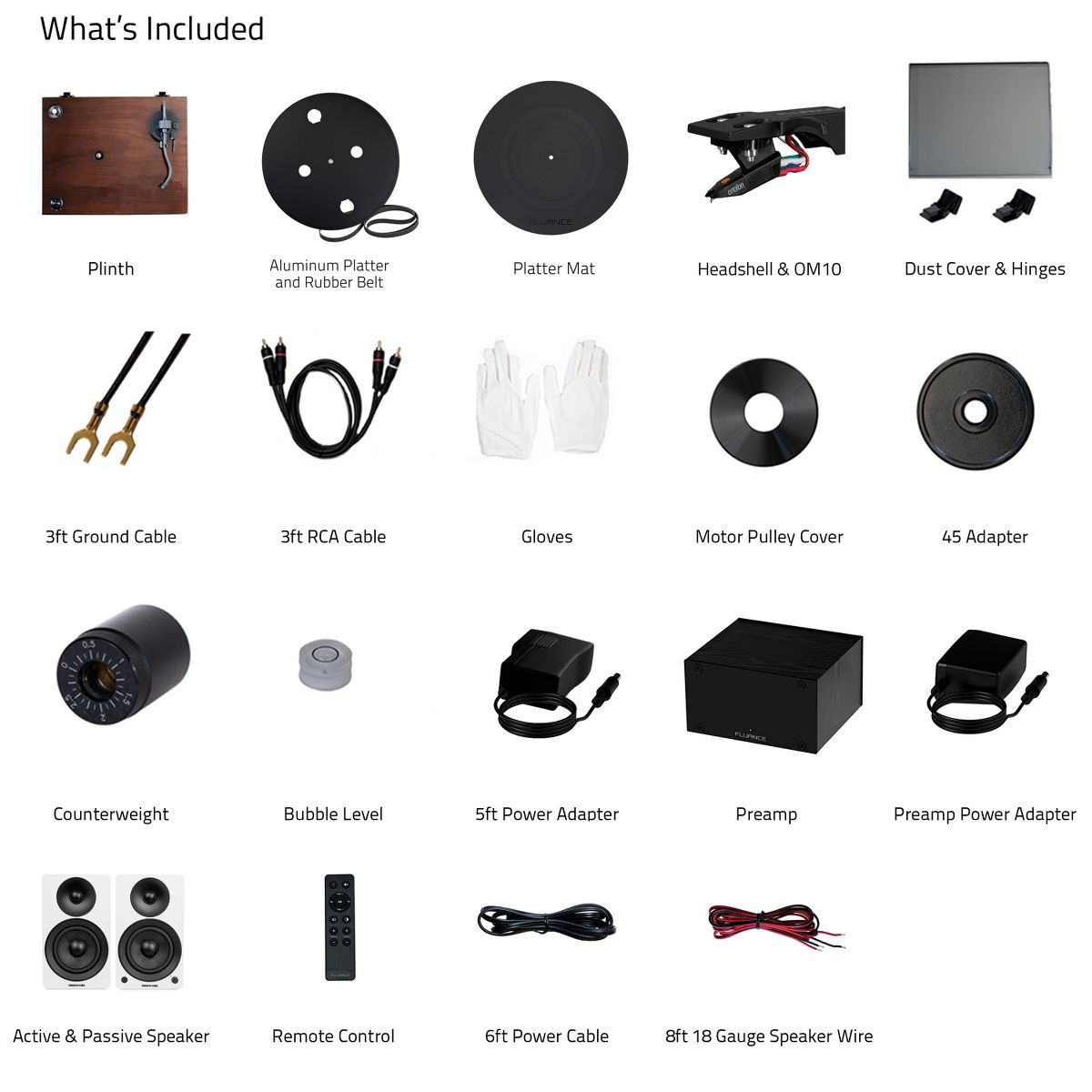 What's Included: RT82 Turntable, Dust Cover + Hinges, Bubble Level, Headshell with Ortofon OM 10 Cartridge, Counterweight, Metal Platter with Belt, Rubber Platter Mat, 5ft 100-240V (50/60Hz) AC Power Adapter, 2x 3ft 90pF RCA Cable, 3ft Ground Wire, 45 Adaptor, Motor Pulley Cap, User Manual, PA10 Unit, Power Adapter, Ai41 Powered Bookshelf Speakers (pair), Remote Control, 2x AAA Batteries, 6ft Power Cable, 8ft 18 Gauge Speaker Wire, Quick Start Guide, 2 Year Manufacturer's Warranty