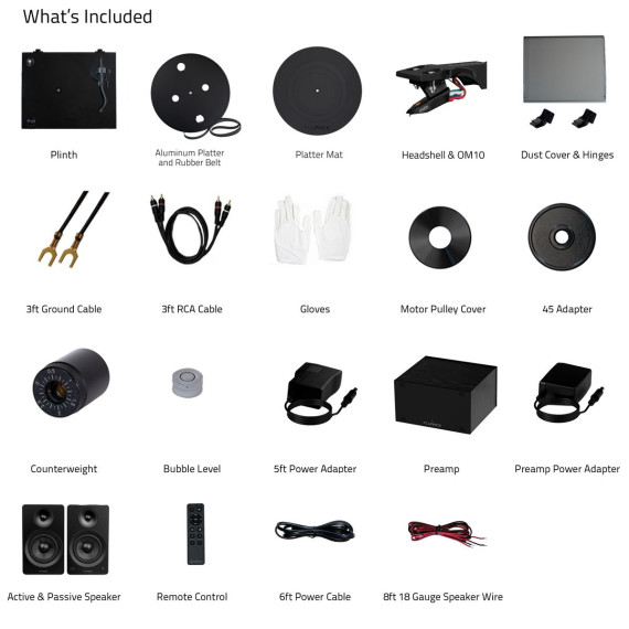 What's Included: RT82 Turntable, Dust Cover + Hinges, Bubble Level, Headshell with Ortofon OM 10 Cartridge, Counterweight, Metal Platter with Belt, Rubber Platter Mat, 5ft 100-240V (50/60Hz) AC Power Adapter, 2x 3ft 90pF RCA Cable, 3ft Ground Wire, 45 Adaptor, Motor Pulley Cap, User Manual, PA10 Unit, Power Adapter, Ai61 Powered Bookshelf Speakers (pair), Remote Control, 2x AAA Batteries, 6ft Power Cable, 8ft 18 Gauge Speaker Wire, Quick Start Guide, 2 Year Manufacturer's Warranty
