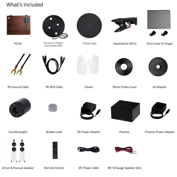 What's Included: RT82 Turntable, Dust Cover + Hinges, Bubble Level, Headshell with Ortofon OM 10 Cartridge, Counterweight, Metal Platter with Belt, Rubber Platter Mat, 5ft 100-240V (50/60Hz) AC Power Adapter, 2x 3ft 90pF RCA Cable, 3ft Ground Wire, 45 Adaptor, Motor Pulley Cap, User Manual, PA10 Unit, Power Adapter, Ai61 Powered Bookshelf Speakers (pair), Remote Control, 2x AAA Batteries, 6ft Power Cable, 8ft 18 Gauge Speaker Wire, Quick Start Guide, 2 Year Manufacturer's Warranty