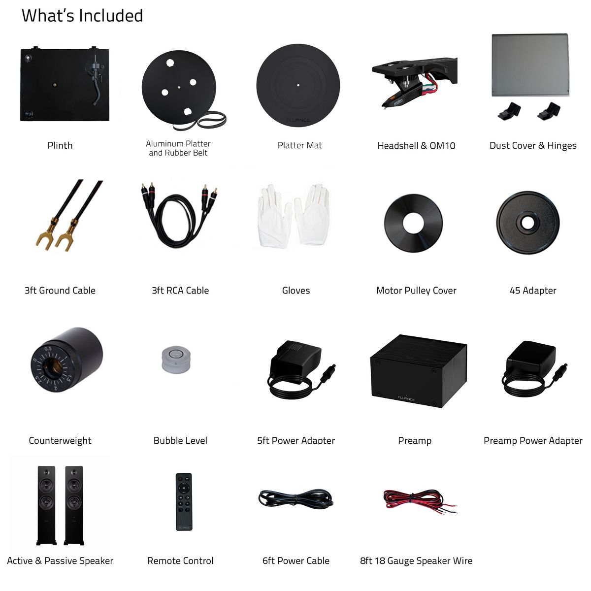 What's Included: RT82 Turntable, Dust Cover, 2x Hinges, Bubble Level, Headshell with Ortofon OM10 Cartridge, Counterweight, Metal Platter with Belt, Rubber Platter Mat, 100-240V (50/60Hz) AC Power Adapter, 3ft RCA Cable, 2x 3ft Ground Wire, 45 Adaptor, Motor Pulley Cap, Ai81 Powered Floorstanding Speakers (pair), Remote Control, 2x AAA Batteries, 6ft Power Cable, 8ft 18 Gauge Speaker Wire, Quick Start Guide, PA10 Unit, Power Adapter, User Manual, 2 Year Manufacturer's Warranty