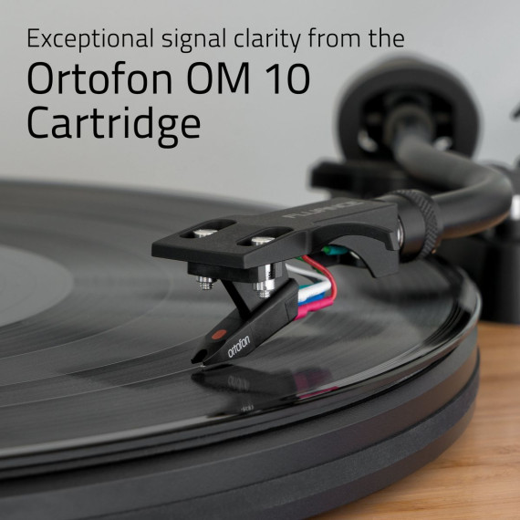 Savor the rich sound of the Ortofon OM10 elliptical stylus; renowned for precise and accurate playback while having a flat frequency response for a natural sound. The servo-controlled belt drive motor maintains an accurate speed while the metal platter, high mass MDF wood plinth and vibration isolation feet inhibit the transfer of unwanted resonance allowing for a greater low frequency signal pickup and improved imaging.