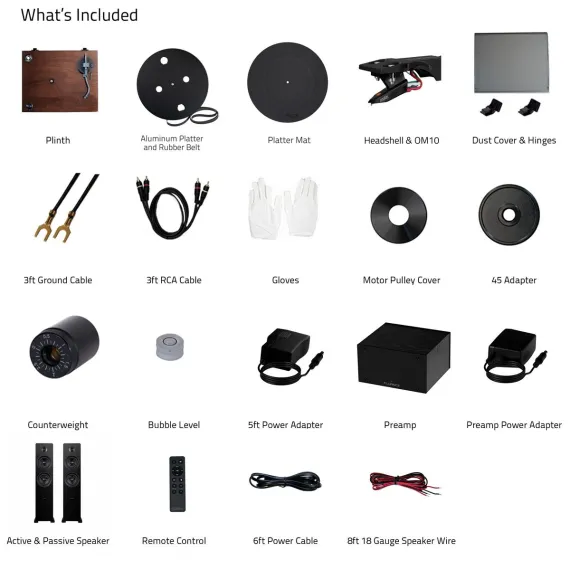 What's Included: RT82 Turntable, Dust Cover, 2x Hinges, Bubble Level, Headshell with Ortofon OM10 Cartridge, Counterweight, Metal Platter with Belt, Rubber Platter Mat, 100-240V (50/60Hz) AC Power Adapter, 3ft RCA Cable, 2x 3ft Ground Wire, 45 Adaptor, Motor Pulley Cap, Ai81 Powered Floorstanding Speakers (pair), Remote Control, 2x AAA Batteries, 6ft Power Cable, 8ft 18 Gauge Speaker Wire, Quick Start Guide, PA10 Unit, Power Adapter, User Manual, 2 Year Manufacturer's Warranty