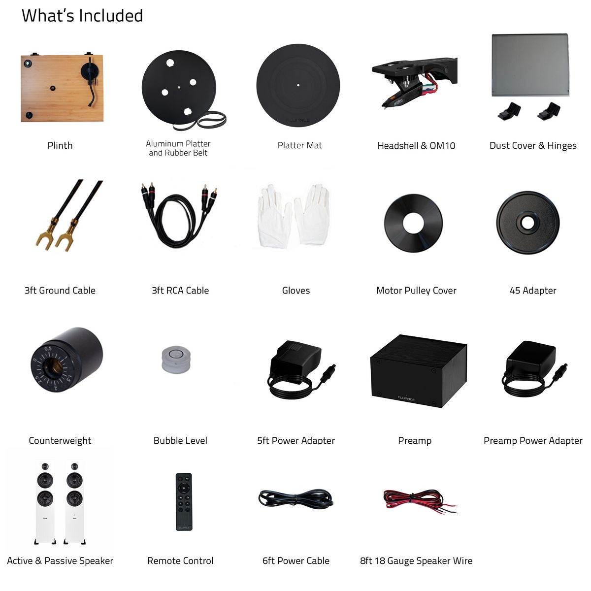 What's Included: RT82 Turntable, Dust Cover, 2x Hinges, Bubble Level, Headshell with Ortofon OM10 Cartridge, Counterweight, Metal Platter with Belt, Rubber Platter Mat, 100-240V (50/60Hz) AC Power Adapter, 3ft RCA Cable, 2x 3ft Ground Wire, 45 Adaptor, Motor Pulley Cap, Ai81 Powered Floorstanding Speakers (pair), Remote Control, 2x AAA Batteries, 6ft Power Cable, 8ft 18 Gauge Speaker Wire, Quick Start Guide, PA10 Unit, Power Adapter, User Manual, 2 Year Manufacturer's Warranty