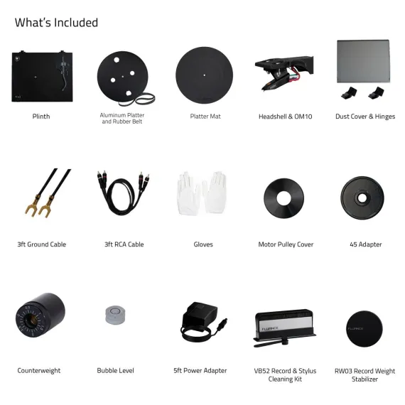 What's Included: RT82 Turntable, Dust Cover + Hinges, Bubble Level, Headshell with Ortofon OM10 Cartridge, Counterweight, Metal Platter with Belt, Rubber Platter Mat, 100-240V (50/60Hz) AC Power Adapter, 3ft RCA Cable, 2x 3ft Ground Wire, 45 Adaptor, Motor Pulley Cap, Cotton Gloves, User Manual, Record Weight (RW03), Vinyl Record Cleaning Kit (VB52), 2 Year Manufacturer's Direct Warranty