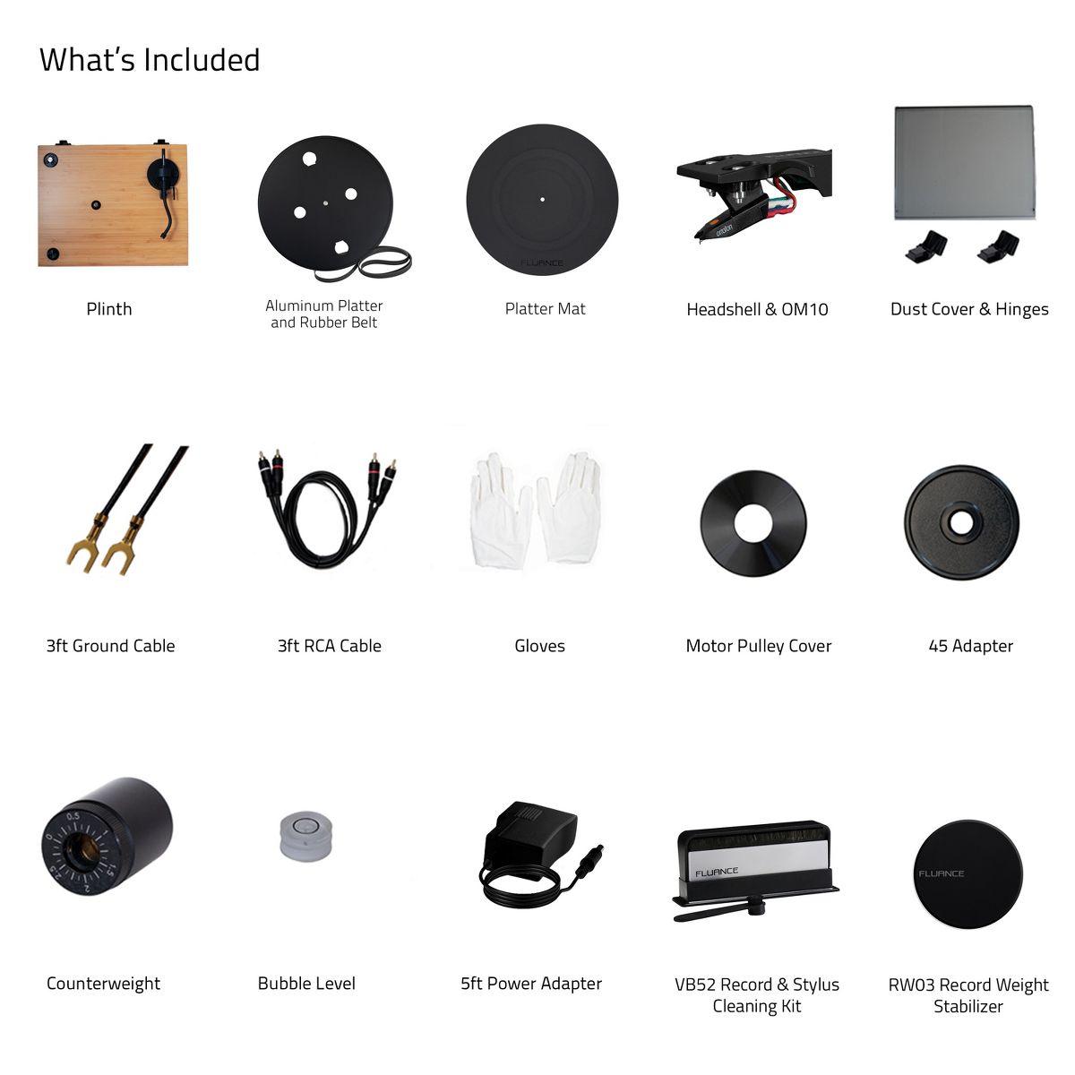 What's Included: RT82 Turntable, Dust Cover + Hinges, Bubble Level, Headshell with Ortofon OM10 Cartridge, Counterweight, Metal Platter with Belt, Rubber Platter Mat, 100-240V (50/60Hz) AC Power Adapter, 3ft RCA Cable, 2x 3ft Ground Wire, 45 Adaptor, Motor Pulley Cap, Cotton Gloves, User Manual, Record Weight (RW03), Vinyl Record Cleaning Kit (VB52), 2 Year Manufacturer's Direct Warranty