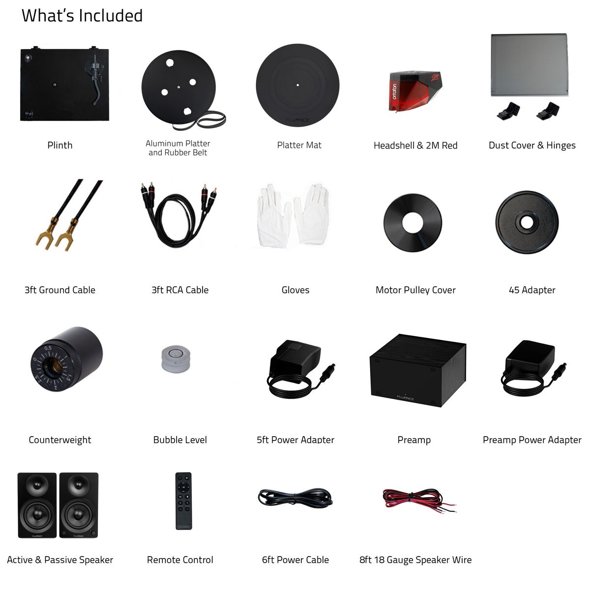 What's Included: RT83 Turntable, Dust Cover + Hinges, Bubble Level, Headshell with Ortofon 2M Red Cartridge, Counterweight, Metal Platter with Belt, Rubber Platter Mat, 5ft 100-240V (50/60Hz) AC Power Adapter, 2x 3ft 90pF RCA Cable, 3ft Ground Wire, 45 Adaptor, Motor Pulley Cap, User Manual, PA10 Unit, Power Adapter, Ai41 Powered Bookshelf Speakers (pair), Remote Control, 2x AAA Batteries, 6ft Power Cable, 8ft 18 Gauge Speaker Wire, Quick Start Guide, 2 Year Manufacturer's Warranty
