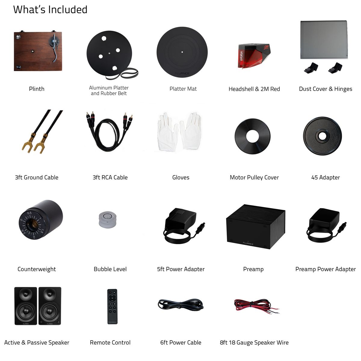 What's Included: RT83 Turntable, Dust Cover + Hinges, Bubble Level, Headshell with Ortofon 2M Red Cartridge, Counterweight, Metal Platter with Belt, Rubber Platter Mat, 5ft 100-240V (50/60Hz) AC Power Adapter, 2x 3ft 90pF RCA Cable, 3ft Ground Wire, 45 Adaptor, Motor Pulley Cap, User Manual, PA10 Unit, Power Adapter, Ai41 Powered Bookshelf Speakers (pair), Remote Control, 2x AAA Batteries, 6ft Power Cable, 8ft 18 Gauge Speaker Wire, Quick Start Guide, 2 Year Manufacturer's Warranty