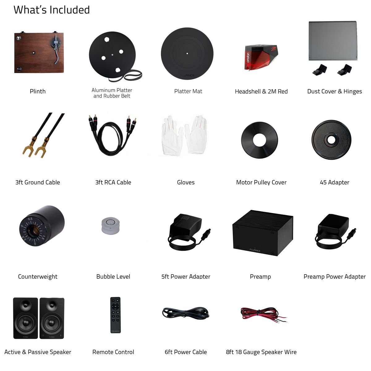 What's Included: RT83 Turntable, Dust Cover + Hinges, Bubble Level, Headshell with Ortofon 2M Red Cartridge, Counterweight, Metal Platter with Belt, Rubber Platter Mat, 5ft 100-240V (50/60Hz) AC Power Adapter, 2x 3ft 90pF RCA Cable, 3ft Ground Wire, 45 Adaptor, Motor Pulley Cap, User Manual, PA10 Unit, Power Adapter, Ai61 Powered Bookshelf Speakers (pair), Remote Control, 2x AAA Batteries, 6ft Power Cable, 8ft 18 Gauge Speaker Wire, Quick Start Guide, 2 Year Manufacturer's Warranty