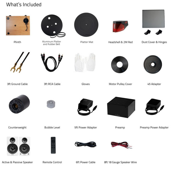 What's Included: RT83 Turntable, Dust Cover + Hinges, Bubble Level, Headshell with Ortofon 2M Red Cartridge, Counterweight, Metal Platter with Belt, Rubber Platter Mat, 5ft 100-240V (50/60Hz) AC Power Adapter, 2x 3ft 90pF RCA Cable, 3ft Ground Wire, 45 Adaptor, Motor Pulley Cap, User Manual, PA10 Unit, Power Adapter, Ai61 Powered Bookshelf Speakers (pair), Remote Control, 2x AAA Batteries, 6ft Power Cable, 8ft 18 Gauge Speaker Wire, Quick Start Guide, 2 Year Manufacturer's Warranty