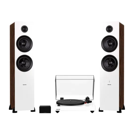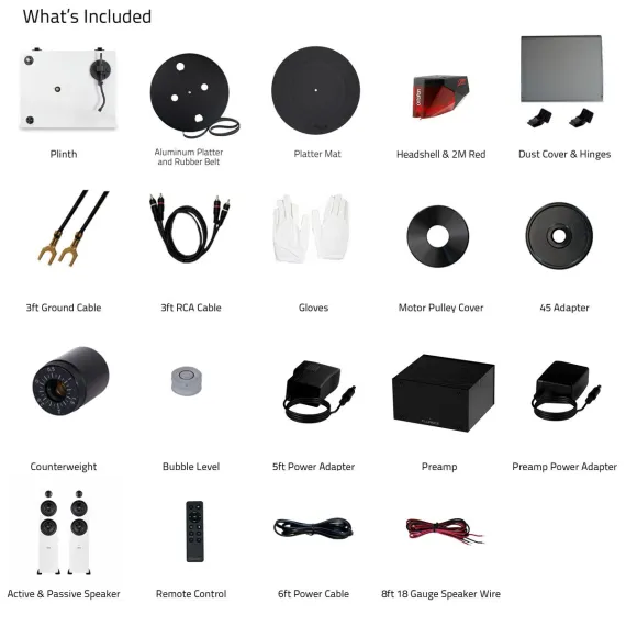 What's Included: RT83 Turntable, Dust Cover, 2x Hinges, Bubble Level, Headshell with Ortofon 2M Red Cartridge, Counterweight, Metal Platter with Belt, Rubber Platter Mat, 5ft 100 - 240 V (50/60Hz) AC Power Adapter, 3ft RCA Cable, 3ft Ground Wire, 45 Adaptor, Motor Pulley Cap, Ai81 Powered Floorstanding Speakers (pair), Remote Control, 2x AAA Batteries, 6ft Power Cable, 8ft 18 Gauge Speaker Wire, Quick Start Guide, PA10 Unit, Power Adapter, User Manual, 2 Year Manufacturer's Warranty