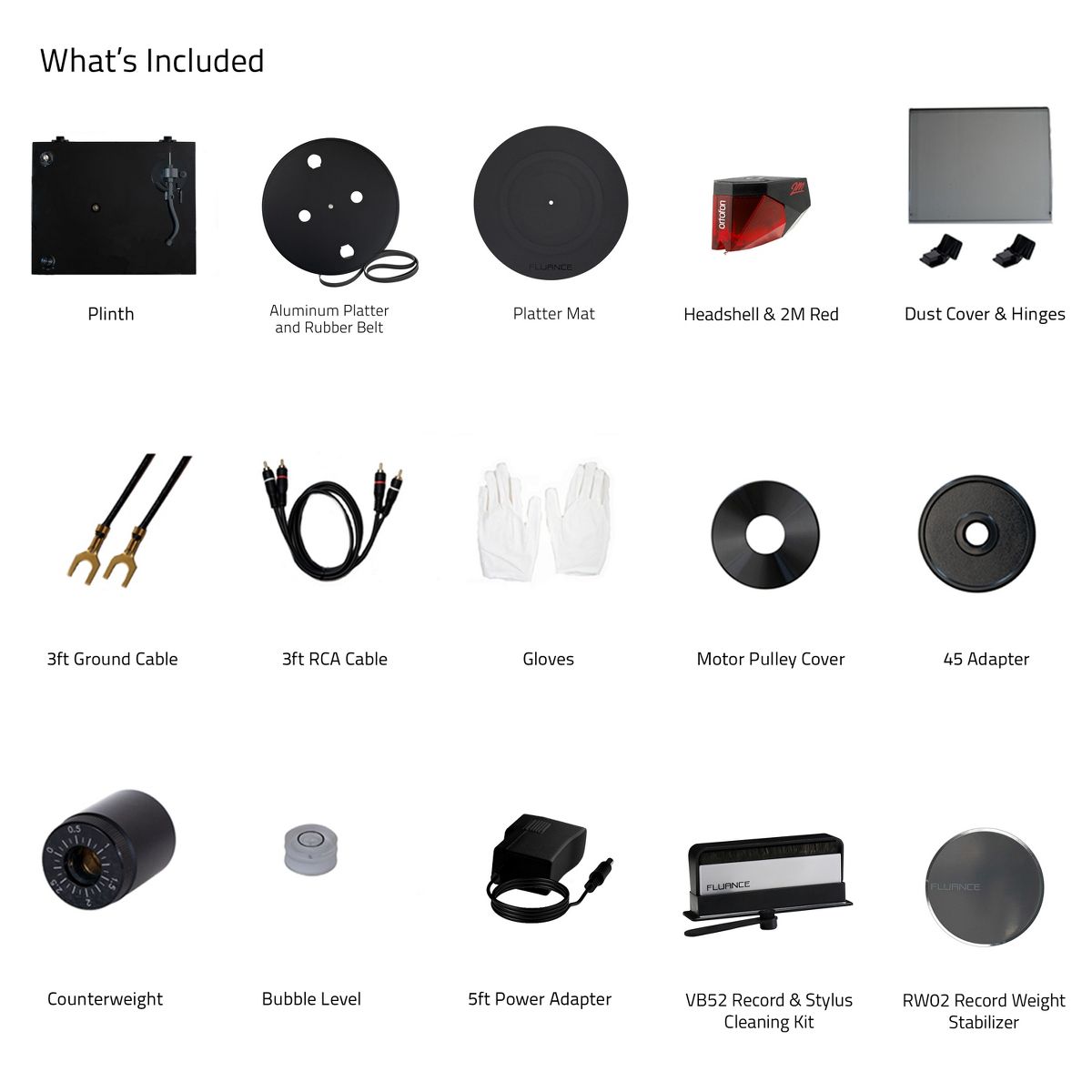 What's Included: RT83 Turntable, Dust Cover + Hinges, Bubble Level, Headshell with Ortofon 2M Red Cartridge, Counterweight, Metal Platter with Belt, Rubber Platter Mat, 100-240V (50/60Hz) AC Power Adapter, 3ft RCA Cable, 2x 3ft Ground Wire, 45 Adaptor, Motor Pulley Cap, Cotton Gloves, User Manual, Record Weight (RW02), Vinyl Record Cleaning Kit (VB52), 2 Year Manufacturer's Direct Warranty