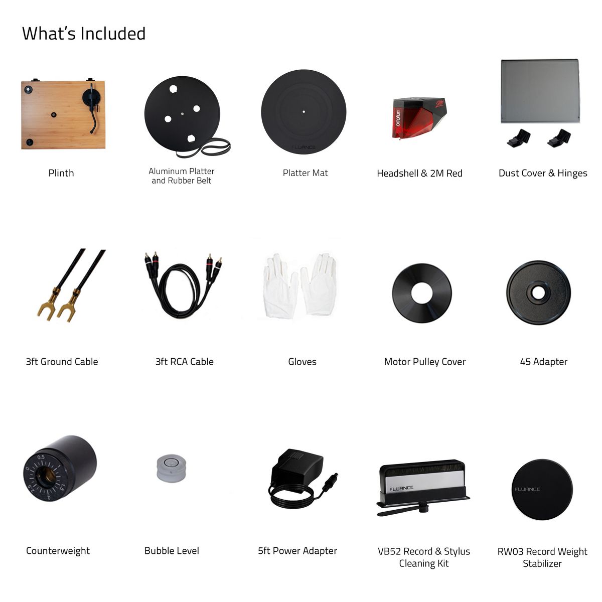 What's Included: RT83 Turntable, Dust Cover + Hinges, Bubble Level, Headshell with Ortofon 2M Red Cartridge, Counterweight, Metal Platter with Belt, Rubber Platter Mat, 100-240V (50/60Hz) AC Power Adapter, 3ft RCA Cable, 2x 3ft Ground Wire, 45 Adaptor, Motor Pulley Cap, Cotton Gloves, User Manual, Record Weight (RW03), Vinyl Record Cleaning Kit (VB52), 2 Year Manufacturer's Direct Warranty