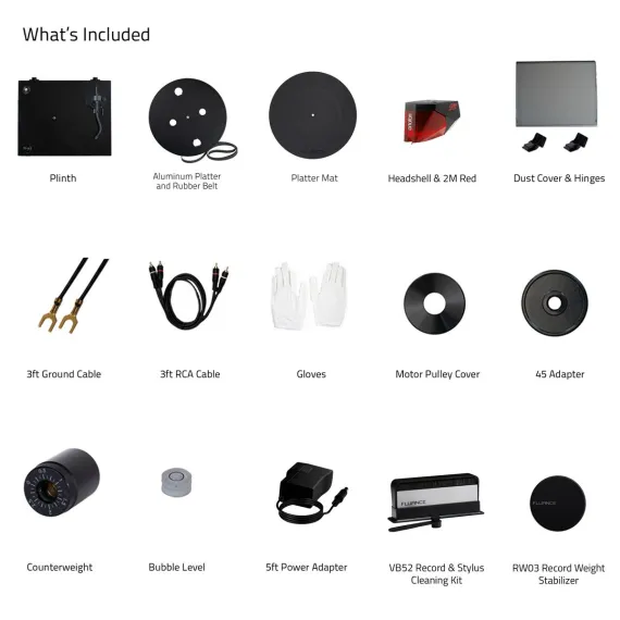 What's Included: RT83 Turntable, Dust Cover + Hinges, Bubble Level, Headshell with Ortofon 2M Red Cartridge, Counterweight, Metal Platter with Belt, Rubber Platter Mat, 100-240V (50/60Hz) AC Power Adapter, 3ft RCA Cable, 2x 3ft Ground Wire, 45 Adaptor, Motor Pulley Cap, Cotton Gloves, User Manual, Record Weight (RW03), Vinyl Record Cleaning Kit (VB52), 2 Year Manufacturer's Direct Warranty