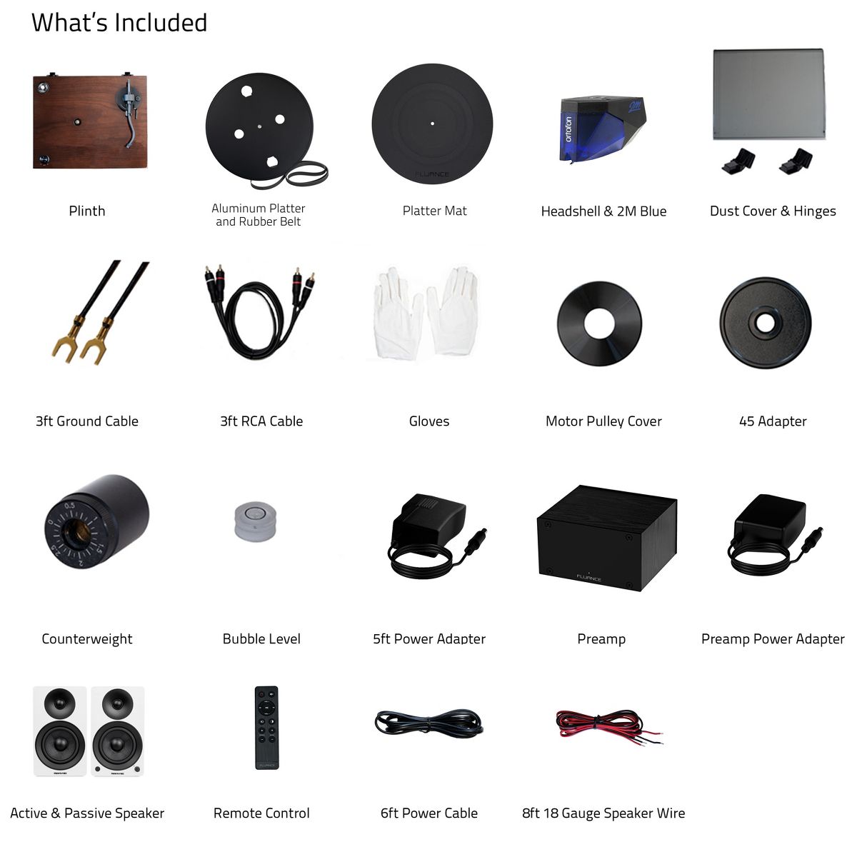 What's Included: RT84 Turntable, Dust Cover + Hinges, Bubble Level, Headshell with Ortofon 2M Blue Cartridge, Counterweight, Metal Platter with Belt, Rubber Platter Mat, 5ft 100-240V (50/60Hz) AC Power Adapter, 2x 3ft 90pF RCA Cable, 3ft Ground Wire, 45 Adaptor, Motor Pulley Cap, User Manual, PA10 Unit, Power Adapter, Ai41 Powered Bookshelf Speakers (pair), Remote Control, 2x AAA Batteries, 6ft Power Cable, 8ft 18 Gauge Speaker Wire, Quick Start Guide, 2 Year Manufacturer's Warranty