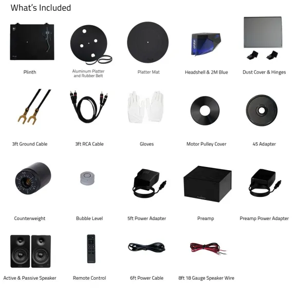 What's Included: RT84 Turntable, Dust Cover + Hinges, Bubble Level, Headshell with Ortofon 2M Blue Cartridge, Counterweight, Metal Platter with Belt, Rubber Platter Mat, 5ft 100-240V (50/60Hz) AC Power Adapter, 2x 3ft 90pF RCA Cable, 3ft Ground Wire, 45 Adaptor, Motor Pulley Cap, User Manual, PA10 Unit, Power Adapter, Ai61 Powered Bookshelf Speakers (pair), Remote Control, 2x AAA Batteries, 6ft Power Cable, 8ft 18 Gauge Speaker Wire, Quick Start Guide, 2 Year Manufacturer's Warranty