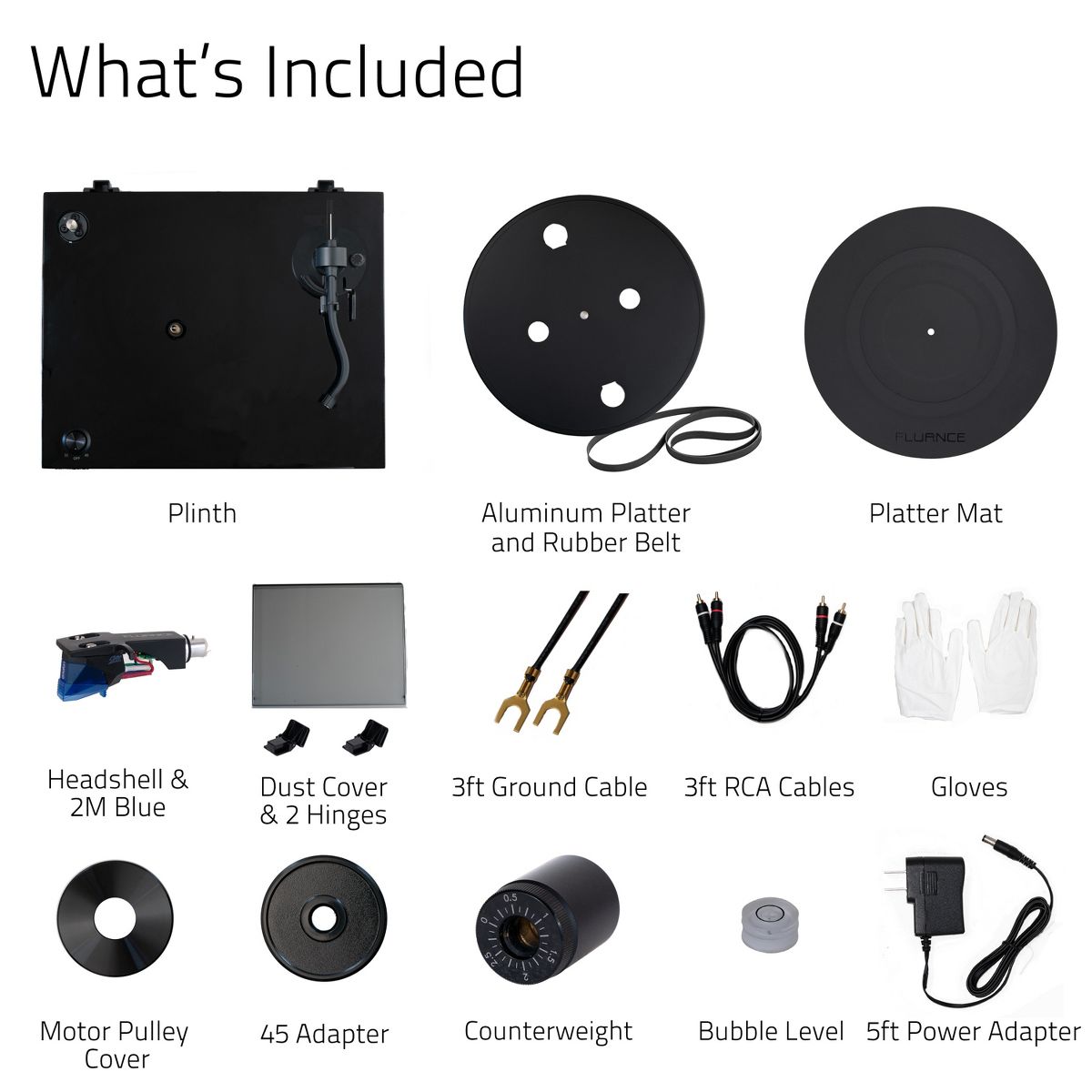 What's Included: RT84 Turntable, Dust Cover + Hinges, Bubble Level, Headshell with Ortofon 2M Blue Cartridge, Counterweight, Aluminum Platter with Rubber Mat and Belt, 100-240V (50/60Hz) AC Power Adapter, 3ft RCA Cable, 2x 3ft Ground Wire, 45 Adaptor, Motor Pulley Cap, Cotton Gloves, User Manual, 2 Year Manufacturer's Direct Warranty