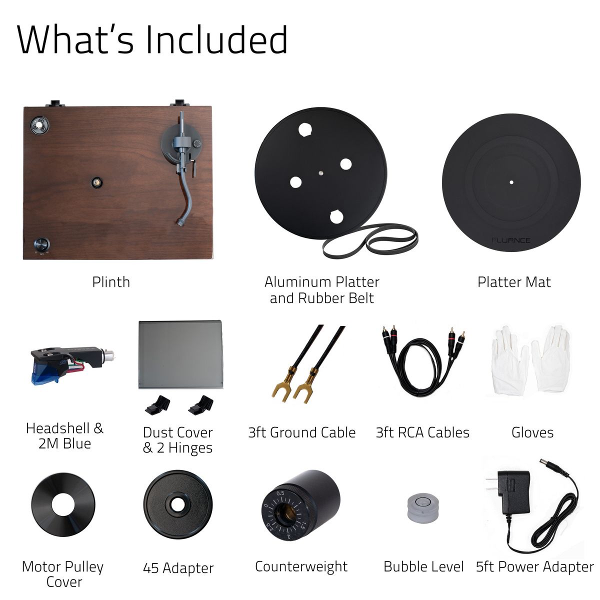 What's Included: RT84 Turntable, Dust Cover + Hinges, Bubble Level, Headshell with Ortofon 2M Blue Cartridge, Counterweight, Aluminum Platter with Rubber Mat and Belt, 100-240V (50/60Hz) AC Power Adapter, 3ft RCA Cable, 2x 3ft Ground Wire, 45 Adaptor, Motor Pulley Cap, Cotton Gloves, User Manual, 2 Year Manufacturer's Direct Warranty