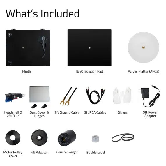 What's Included: RT85 Turntable, Dust Cover + Hinges, Bubble Level, Headshell with Ortofon 2M Blue Cartridge, Counterweight, Acrylic Platter with Belt, 100-240V (50/60Hz) AC Power Adapter, 3ft RCA Cable, 2x 3ft Ground Wire, 45 Adaptor, Motor Pulley Cap, Cotton Gloves, IB40 Isolation Base, User Manual, 2 Year Manufacturer's Direct Warranty