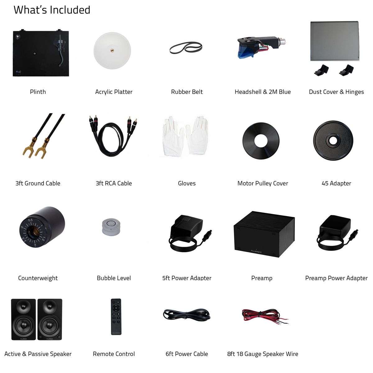 What's Included: RT85 Turntable, Dust Cover + Hinges, Bubble Level, Headshell with Ortofon 2M Blue Cartridge, Counterweight, Acrylic Platter with Belt, Rubber Platter Mat, 5ft 100-240V (50/60Hz) AC Power Adapter, 2x 3ft 90pF RCA Cable, 3ft Ground Wire, 45 Adaptor, Motor Pulley Cap, User Manual, PA10 Unit, Power Adapter, Ai41 Powered Bookshelf Speakers (pair), Remote Control, 2x AAA Batteries, 6ft Power Cable, 8ft 18 Gauge Speaker Wire, Quick Start Guide, 2 Year Manufacturer's Warranty