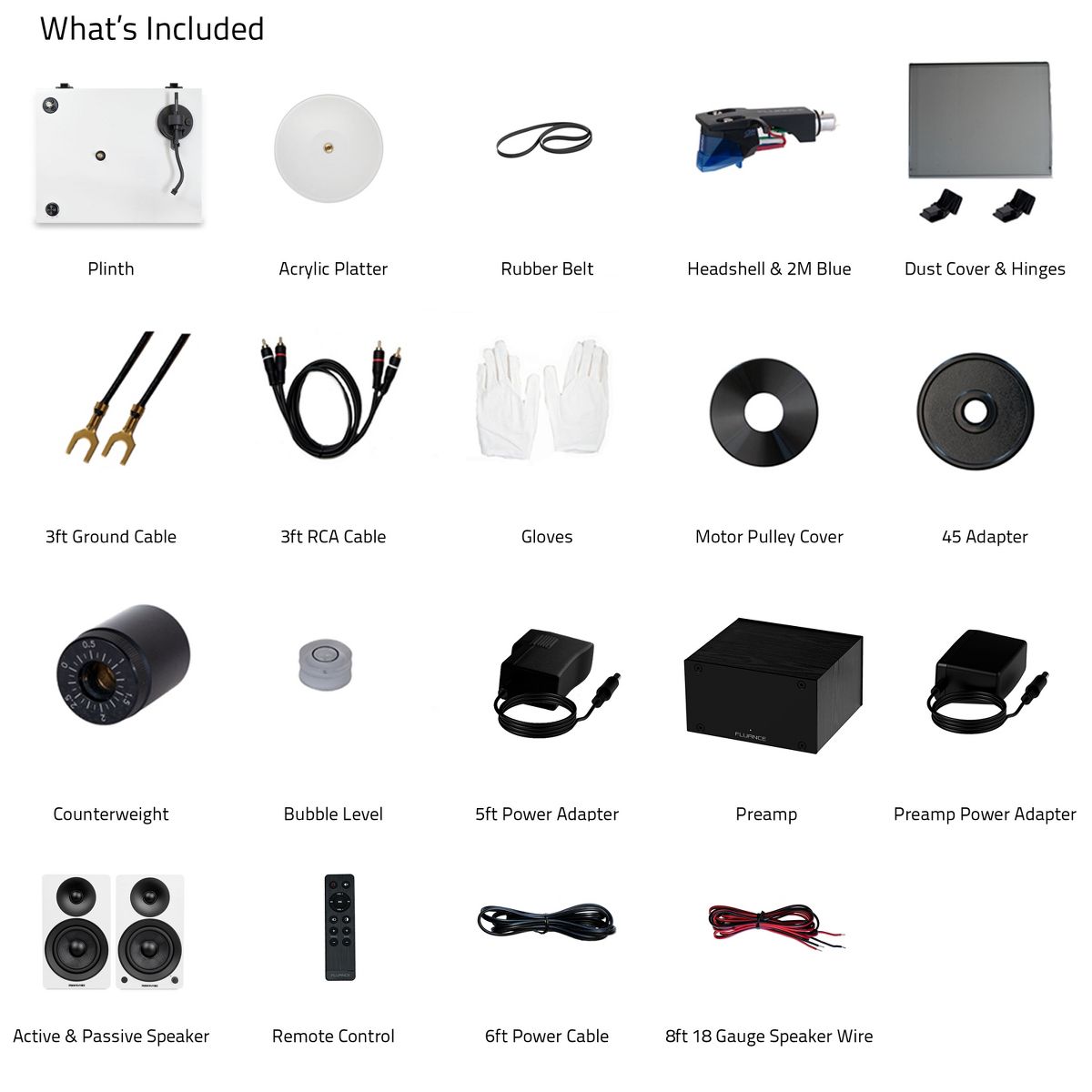 What's Included: RT85 Turntable, Dust Cover + Hinges, Bubble Level, Headshell with Ortofon 2M Blue Cartridge, Counterweight, Acrylic Platter with Belt, Rubber Platter Mat, 5ft 100-240V (50/60Hz) AC Power Adapter, 2x 3ft 90pF RCA Cable, 3ft Ground Wire, 45 Adaptor, Motor Pulley Cap, User Manual, PA10 Unit, Power Adapter, Ai41 Powered Bookshelf Speakers (pair), Remote Control, 2x AAA Batteries, 6ft Power Cable, 8ft 18 Gauge Speaker Wire, Quick Start Guide, 2 Year Manufacturer's Warranty