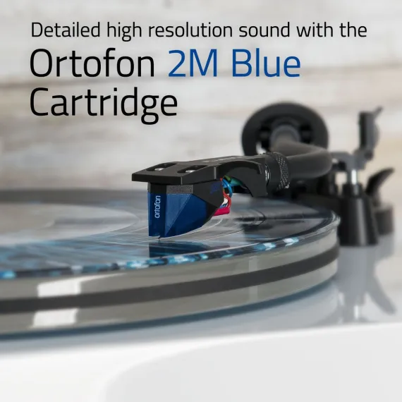 Savor the rich sound of the Ortofon 2M Blue elliptical stylus delivering improved linearity, higher channel separatin and reduced distortion. The servo-controlled belt drive motor maintains an accurate speed while the acrylic platter, high mass MDF wood plinth and vibration isolation feet inhibit the transfer of unwanted resonance allowing for a greater low frequency signal pickup and improved imaging.