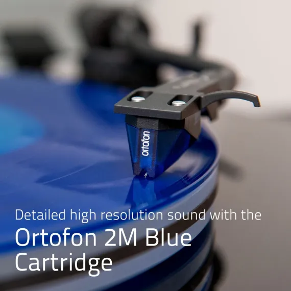 Savor the rich sound of the Ortofon 2M Blue elliptical stylus delivering improved linearity, higher channel separation and reduced distortion. The servo-controlled belt drive motor maintains an accurate speed while the acrylic platter, high mass MDF wood plinth and vibration isolation feet inhibit the transfer of unwanted resonance allowing for greater low frequency signal pickup and improved imaging.