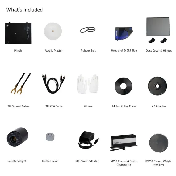 What's Included: RT85 Turntable, Dust Cover + Hinges, Bubble Level, Headshell with Ortofon 2M Blue Cartridge, Counterweight, Acrylic Platter with Belt, 100-240V (50/60Hz) AC Power Adapter, 3ft RCA Cable, 2x 3ft Ground Wire, 45 Adaptor, Motor Pulley Cap, Cotton Gloves, User Manual, Record Weight (RW02), Vinyl Record Cleaning Kit (VB52), 2 Year Manufacturer's Direct Warranty