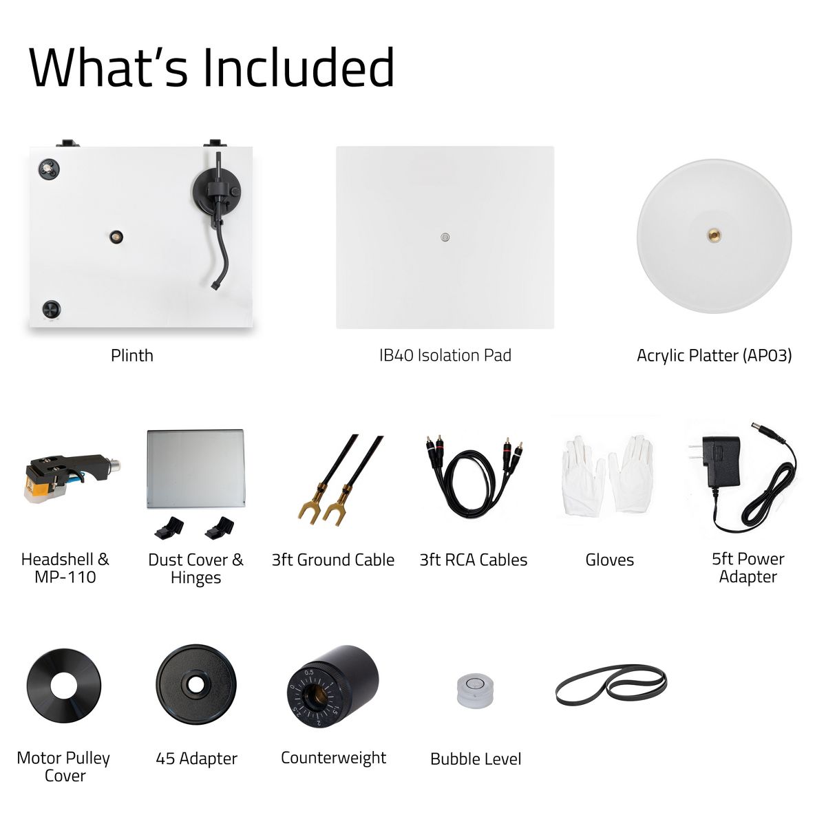 What's Included: RT85N Turntable, Dust Cover + Hinges, Bubble Level, Headshell with Nagaoka MP-110 Cartridge, Counterweight, Acrylic Platter with Belt, 100-240V (50/60Hz) AC Power Adapter, 3ft RCA Cable, 2x 3ft Ground Wire, 45 Adaptor, Motor Pulley Cap, IB40 Isolation Base, Cotton Gloves, User Manual, 2 Year Manufacturer's Direct Warranty