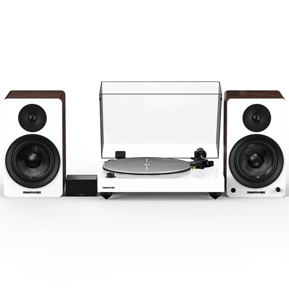 What's Included: RT85N Turntable, Dust Cover + Hinges, Bubble Level, Headshell with Nagaoka MP-110 Cartridge, Counterweight, Acrylic Platter with Belt, 100-240V (50/60Hz) AC Power Adapter, 3ft RCA Cable, 2x 3ft Ground Wire, 45 Adaptor, Motor Pulley Cap, Cotton Gloves, Ai61 Powered Bookshelf Speakers (pair), Remote Control, 2x AAA Batteries, 6ft Power Cable, 8ft 18 Gauge Speaker Wire, Quick Start Guide, 2 Year Manufacturer's Warranty
