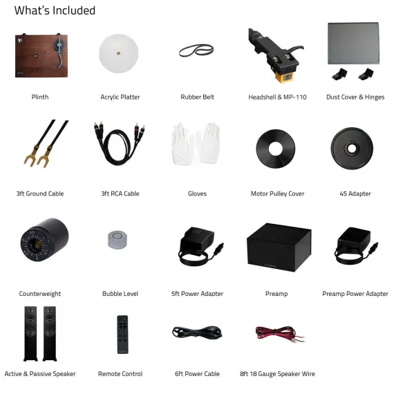 What's Included: RT85N Turntable, Dust Cover, 2x Hinges, Bubble Level, Headshell with Nagaoka MP-110 Cartridge, Counterweight, Acrylic Platter with Belt, 100-240V (50/60Hz) AC Power Adapter, 3ft RCA Cable, 2x 3ft Ground Wire, 45 Adaptor, Motor Pulley Cap, Cotton Gloves, Ai81 Powered Floorstanding Speakers (pair), Remote Control, 2x AAA Batteries, 6ft Power Cable, 8ft 18 Gauge Speaker Wire, Quick Start Guide, PA10 Unit, Power Adapter, User Manual, 2 Year Manufacturer's Warranty