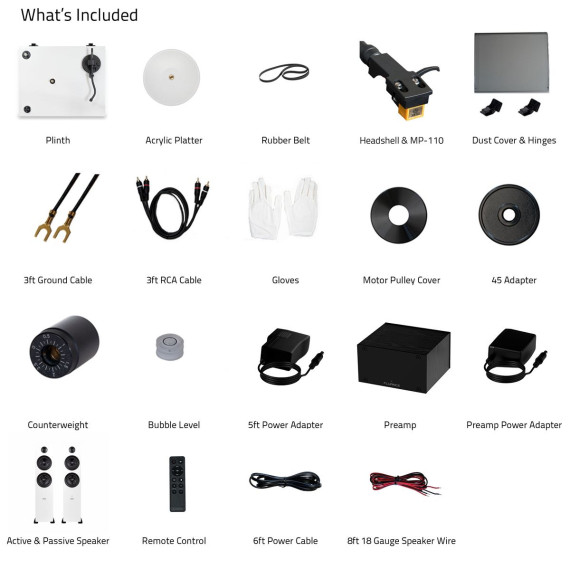 What's Included: RT85N Turntable, Dust Cover, 2x Hinges, Bubble Level, Headshell with Nagaoka MP-110 Cartridge, Counterweight, Acrylic Platter with Belt, 100-240V (50/60Hz) AC Power Adapter, 3ft RCA Cable, 2x 3ft Ground Wire, 45 Adaptor, Motor Pulley Cap, Cotton Gloves, Ai81 Powered Floorstanding Speakers (pair), Remote Control, 2x AAA Batteries, 6ft Power Cable, 8ft 18 Gauge Speaker Wire, Quick Start Guide, PA10 Unit, Power Adapter, User Manual, 2 Year Manufacturer's Warranty