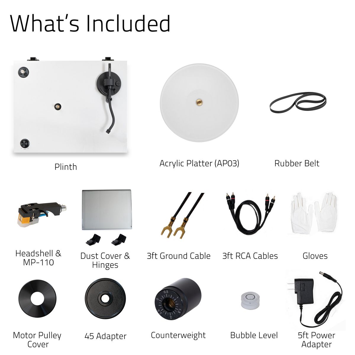 What's Included: RT85N Turntable, Dust Cover + Hinges, Bubble Level, Headshell with Nagaoka MP-110 Cartridge, Counterweight, Acrylic Platter with Belt, 100-240V (50/60Hz) AC Power Adapter, 3ft RCA Cable, 2x 3ft Ground Wire, 45 Adaptor, Motor Pulley Cap, Cotton Gloves, User Manual, 2 Year Manufacturer's Direct Warranty