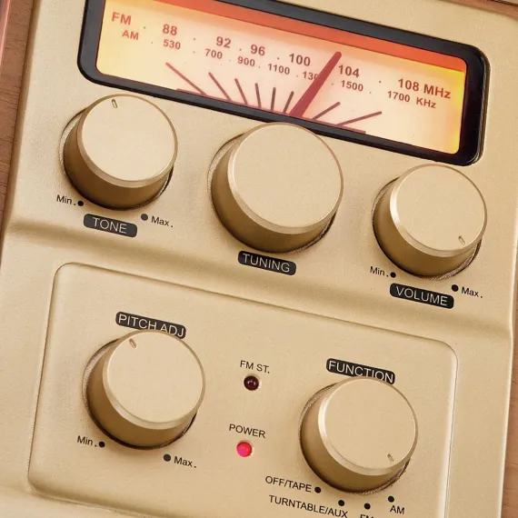 Enjoy your music any way you want to with the JENSEN® JTA-385. This belt-driven 3-speed turntable with pitch control includes two built-in speakers, AM/FM receiver with back-lit analog tuning dial, aux-in, headphone and RCA line-out jacks. The built-in cassette player/recorder lets you play your favorite cassettes as well as record directly from turntable, radio, or aux-in. This turntable also features a vintage throwback style with design elements like woodgrain finish, woven fabric speaker covers, gold cabinet accents and our classic JENSEN® logo. The unit also includes a tone control, 45 RPM record adaptor, and it operates on 120V AC power.
