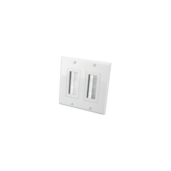 Highlights:Two gangWhiteBrush style bulk cable wall plateDecor styleBrush sides provide flexibility and cable protectionAllows for multiple cables to be organized for a professional installationFits on a dual gang electrical J-Box or low voltage mounting bracketOpenings approximately: 3/4" x 2-1/8"Trim plate and mounting screws includedCancer and Reproductive Harm - www.P65Warnings.ca.gov.