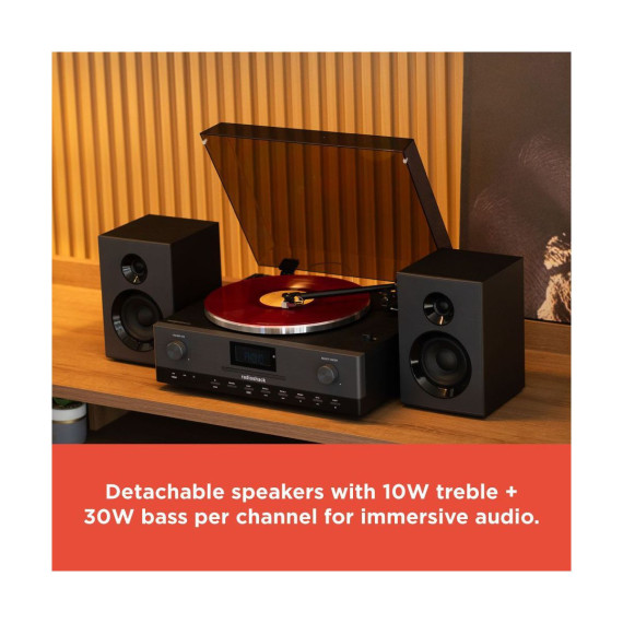 Elevate your audio experience with the RadioShack Professional Wireless Turntable with 2 Detachable Speakers (Model 4001798)—a premium solution for vinyl enthusiasts and modern music lovers. Combining classic analog performance with advanced multimedia features, this turntable delivers high-fidelity sound and unmatched versatility. Enjoy your favorite records with precision thanks to the belt-drive system and professional-grade moving magnet cartridge, ensuring accurate playback and rich, warm tones. The full-size aluminum platter with anti-skating adjustment provides balanced tonearm movement for superior audio quality. Compatible with vinyl records up to 12 inches, this turntable plays at three speeds—33 1/3, 45, and 78 RPM, covering your entire collection.