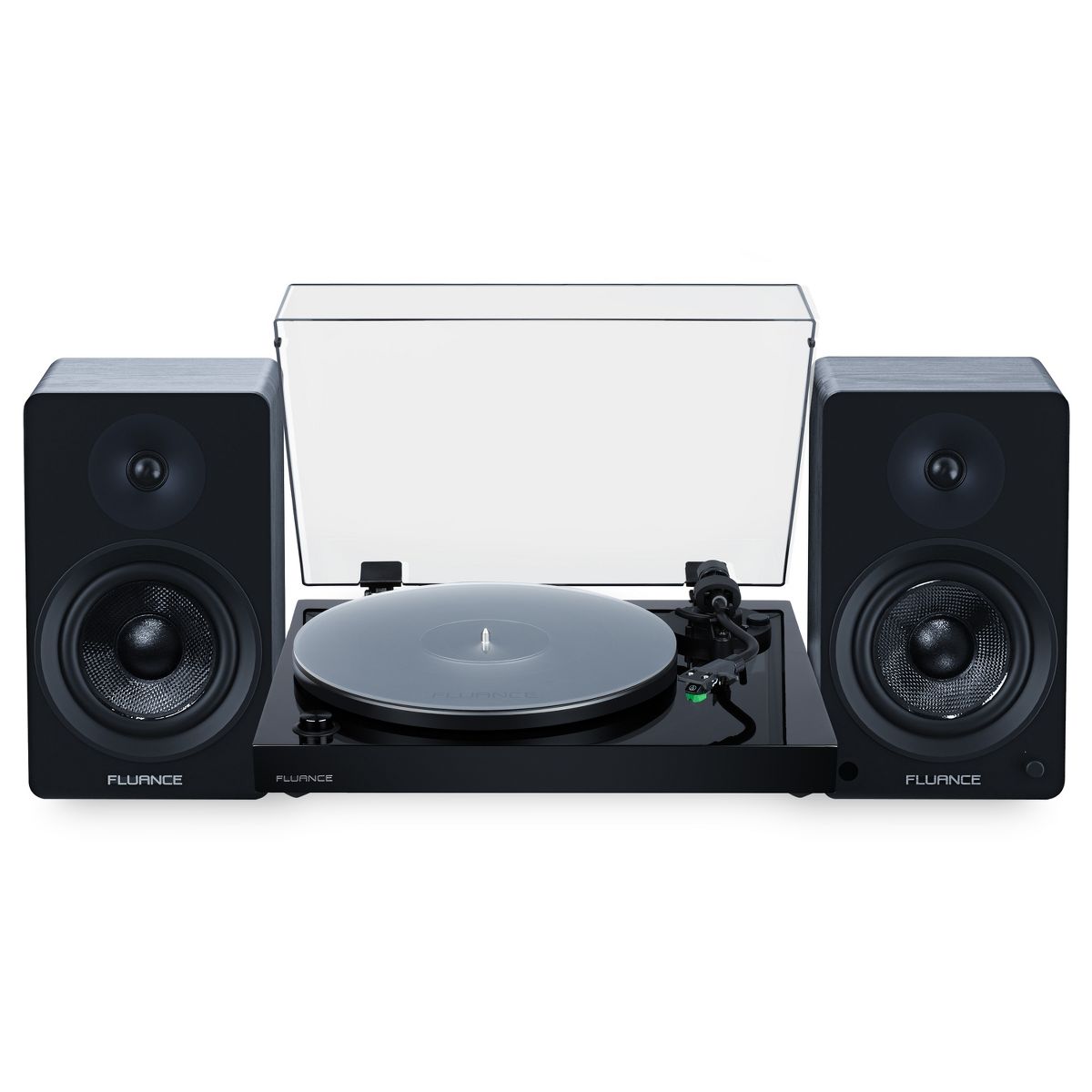 What's Included: RT81P Turntable, Dust Cover, 2x Dust Cover Hinges, Headshell with Audio Technica VM95E Cartridge, Counterweight, Aluminum Anti-Resonant Platter, Acrylic Platter Mat, Rubber Belt, 45 Adapter, Bubble Level, 3ft RCA Cable With Ground Wire, 5ft 100V - 240V (50/60Hz) AC Power Adapter, Ai61 Powered Bookshelf Speakers (pair), Remote Control, 2x AAA Batteries, 6ft Power Cable, 8ft 18 Gauge Speaker Wire, Quick Start Guide, Fluance Catalog, 2 Year Manufacturer's Warranty