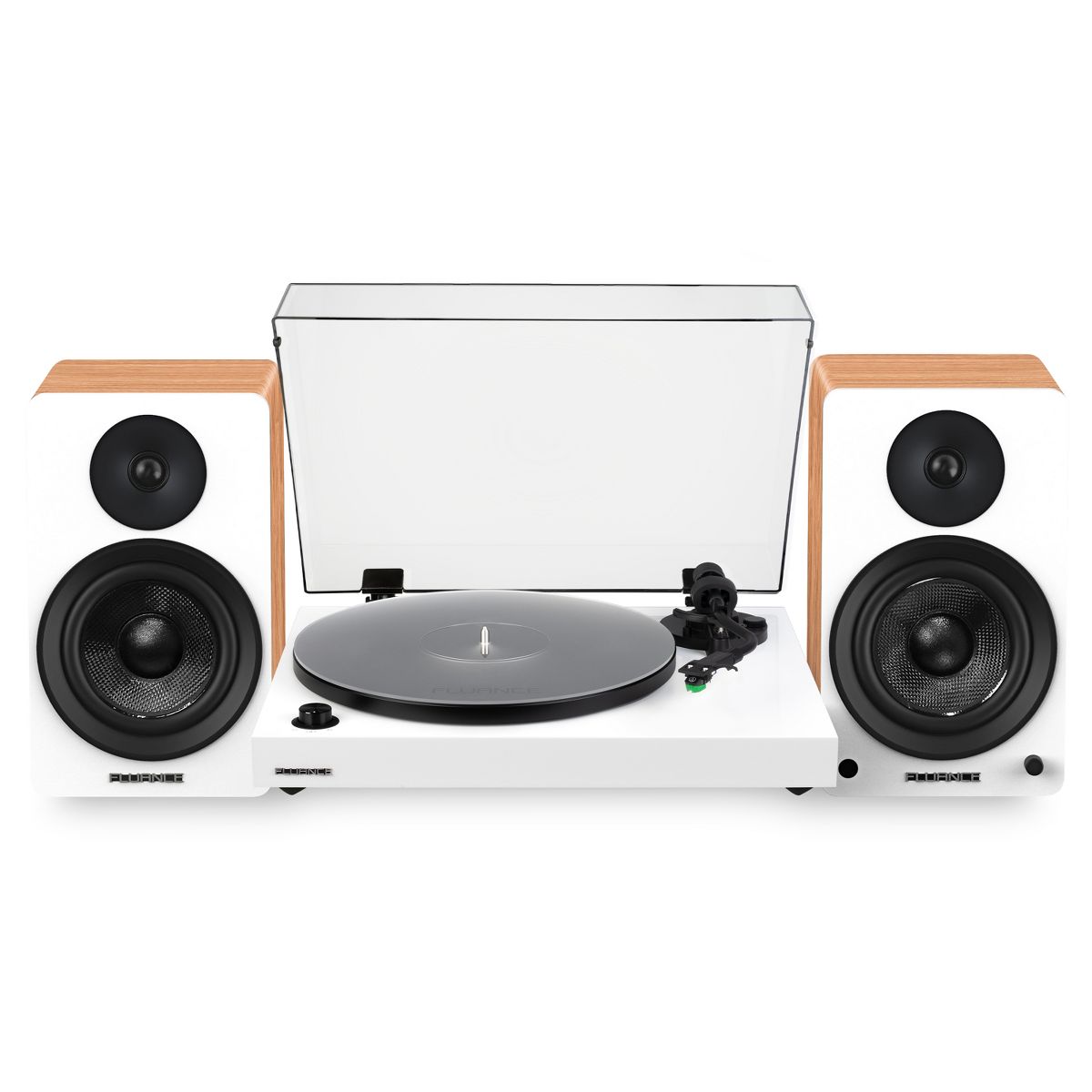 What's Included: RT81P Turntable, Dust Cover, 2x Dust Cover Hinges, Headshell with Audio Technica VM95E Cartridge, Counterweight, Aluminum Anti-Resonant Platter, Acrylic Platter Mat, Rubber Belt, 45 Adapter, Bubble Level, 3ft RCA Cable With Ground Wire, 5ft 100V - 240V (50/60Hz) AC Power Adapter, Ai61 Powered Bookshelf Speakers (pair), Remote Control, 2x AAA Batteries, 6ft Power Cable, 8ft 18 Gauge Speaker Wire, Quick Start Guide, Fluance Catalog, 2 Year Manufacturer's Warranty
