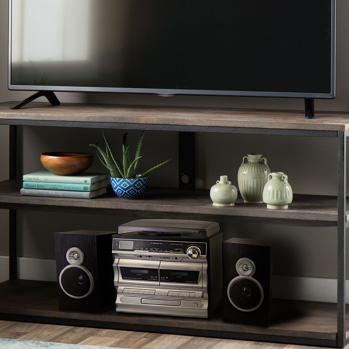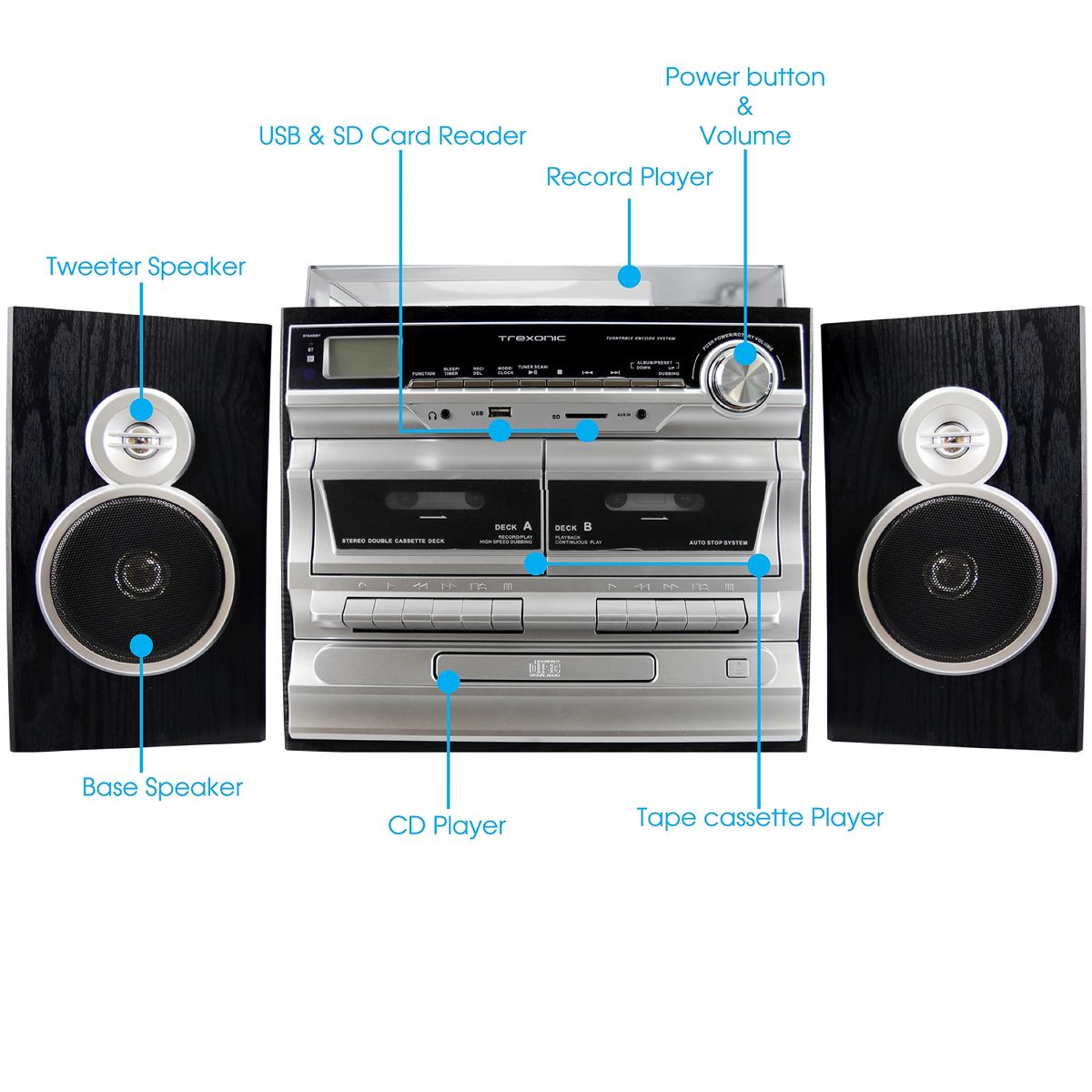 The Trexonic 3-Speed Turntable with CD Player, Dual Cassette Player, Wired Shelf Speakers, FM Radio & CD/USB/SD Recording blends seamlessly into your décor yet, adds a special touch of sophistication to your entertainment center. This compact yet powerful system will allow you to enjoy your favorite music from a wide range of media such as cassettes, vinyl records, CDs, digitally recorded music from your USB Flash Drive, SD Card or content from your Bluetooth enabled devices. This unit features two wired shelf speakers which easily connect to the main turntable unit. Setting up the system is simple and intuitive. You can easily convert music from Vinyl directly to MP3 format with this sleek and sophisticated home stereo turntable. In addition you'll have direct USB and SD Encoding from the Turntable, CD, Cassette, AUX Input, and FM Radio. This system is sure to please those looking for the comfort of warm memories, as well as a new generation seeking to connect to musical classics the burst from analog vinyl records. Includes One Turntable (17" x 13" x 13" - 7 lbs), and One Remote Control. The stunning new turntable home stereo system from Trexonic will bring a sense of musical nostalgia to your home or office.