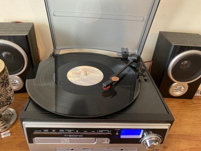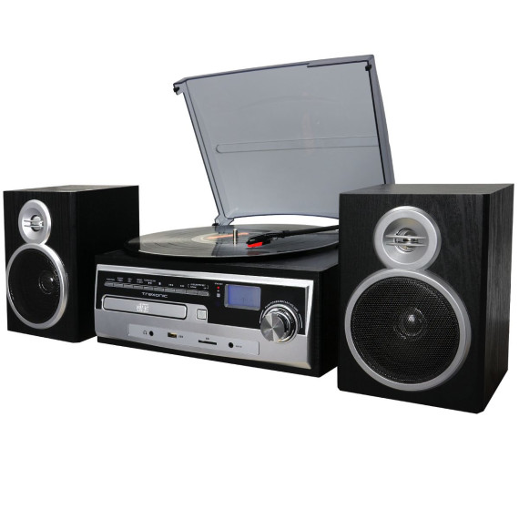The Trexonic 3-Speed Vinyl Turntable Home Stereo System with CD Player, FM Radio, Bluetooth, USB/SD Recording and Wired Shelf Speakers blends seamlessly into your décor yet, adds a special touch of sophistication to your entertainment center. This compact yet powerful system will allow you to enjoy your favorite music from a wide range of media such as vinyl records, CDs, digitally recorded music from your USB and SD or content from your Bluetooth enabled devices.