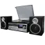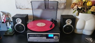 This unit features two wired shelf speakers which easily connect to the main turntable unit. Setting up the system is simple and intuitive. You can easily convert music from Vinyl directly to MP3 format with this sleek and sophisticated home stereo turntable. In addition you'll have direct USB and SD Encoding from the Turntable, CD, AUX Input, and FM Radio.