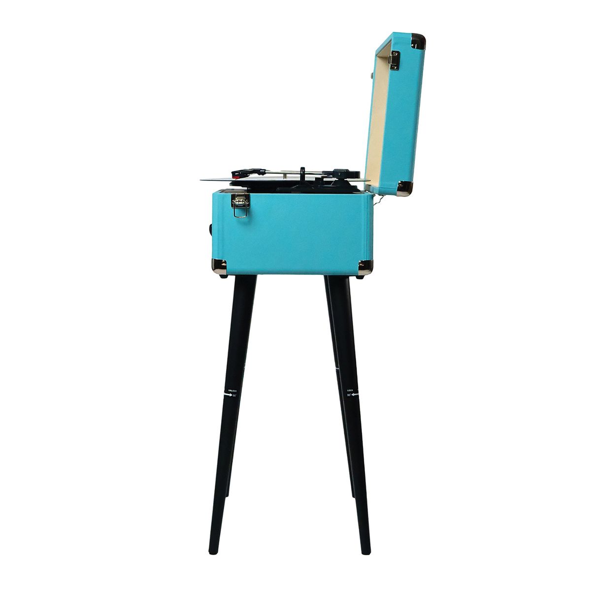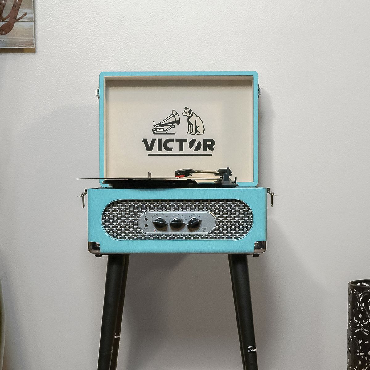 The Victor® Andover 5-in-1 Suitcase-Style Record Player features chair height legs for a fun retro style. The built-in 3-speed turntable and FM radio are ready to play all your favorite songs! The Dual-Bluetooth® feature allows streaming of your vinyl records to an external Bluetooth® speaker (sold separately) or plays music from your smart device through Andover's built-in speakers. The 3.5-mm aux Input and RCA stereo output allow for even more additional playback options. The Andover can also be used on a tabletop as base height feet are included.