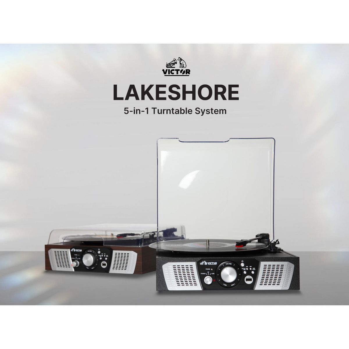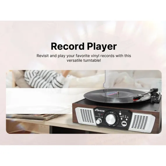 VICTOR Lakeshore 5-in-1 Turntable System with 3-Speed Record Player, Dual Bluetooth In & Out, USB Playback & Record, and Built-in Stereo Speakers,
