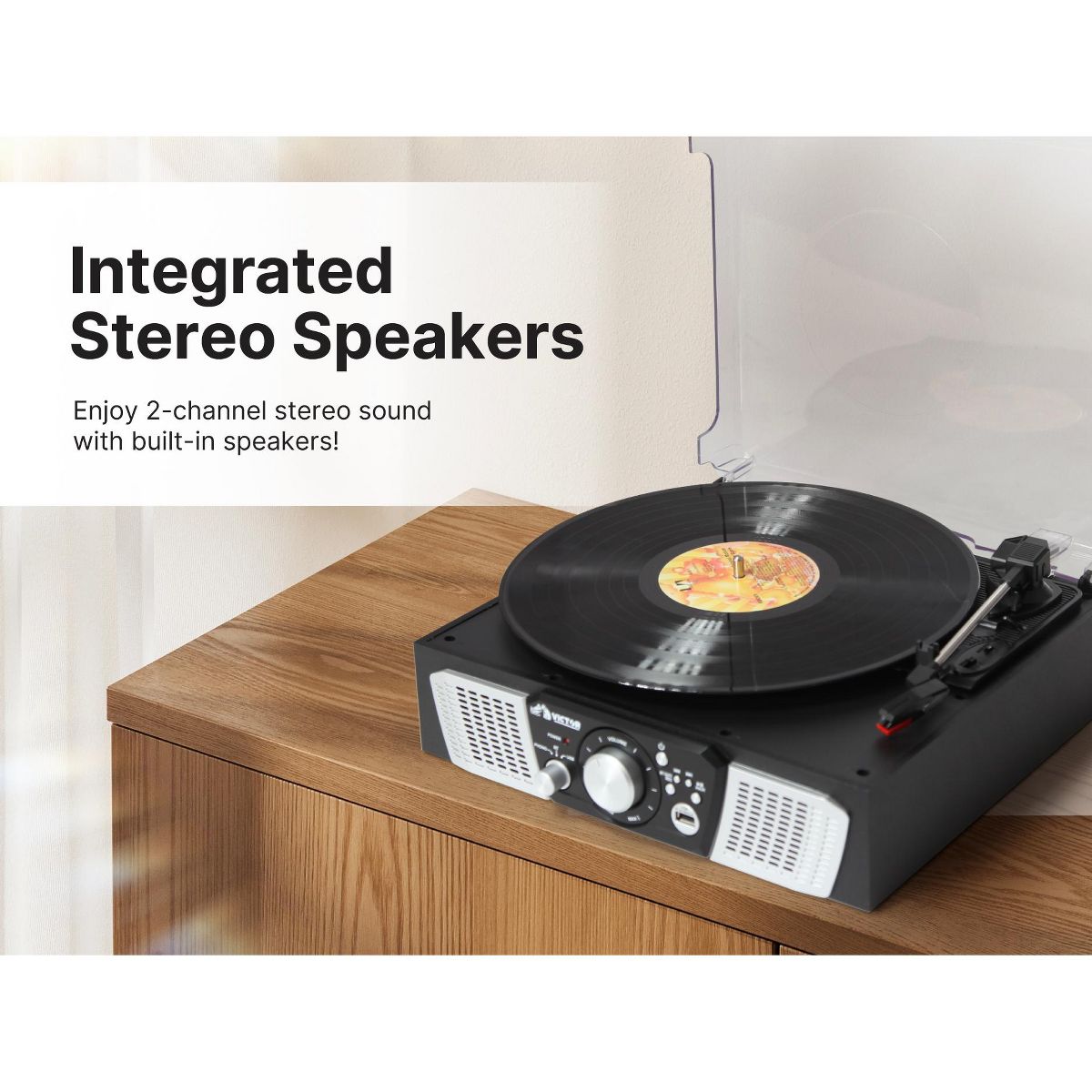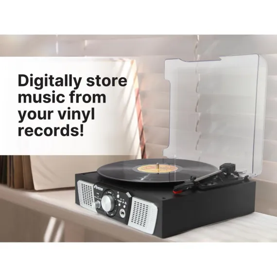 Victor Lakeshore 5-in-1 Turntable is ready to play your vinyl records with the built in 3-Speed Turntable! The Dual Bluetooth feature allows streaming of your vinyl records to an external Bluetooth Speaker or plays music from your Smart Device through the Lakeshore's built in Speakers. Placing a thumb Drive into the USB Slot allows easy Recording and Playback of your Albums. The 3.5mm Aux Input & RCA Audio Output allow for even more additional Playback options.