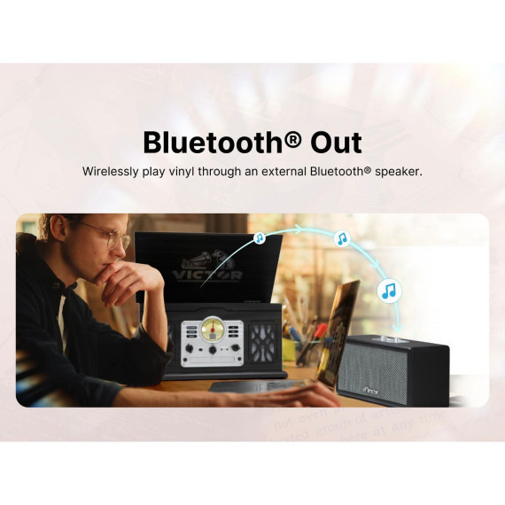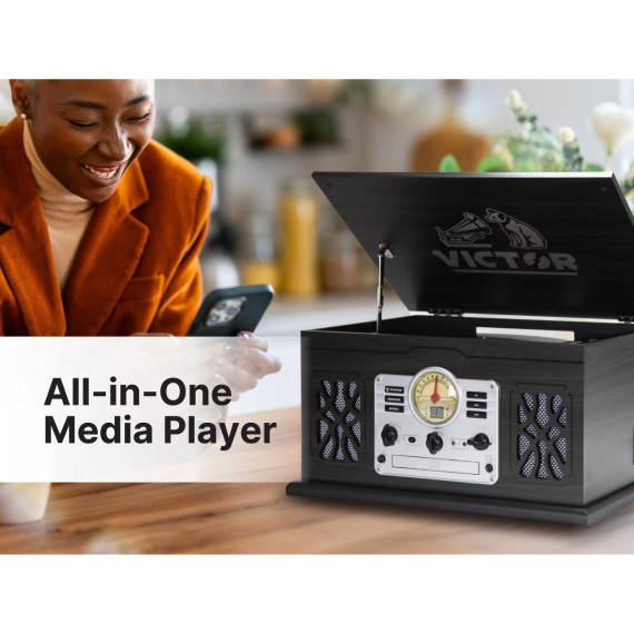 VICTOR State 7-in-1 Turntable Music Center with 3-Speed Record Player, CD/MP3/Cassette Player, FM Radio, Dual Bluetooth In & Out, and Built-in Stereo