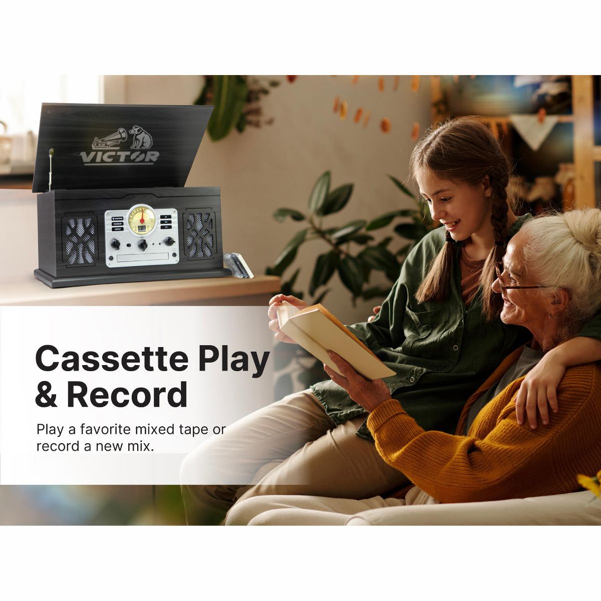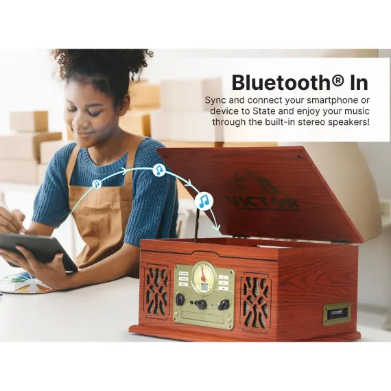 Victor State 7-in-1 Espresso Wood Music Center is loaded with features at an attractive price point. The 3 Speed turntable stands ready to play your favorite vinyl. The Dual Bluetooth model allows streaming of your music to an external speaker. Includes a cassette & CD Player, built in Speakers, and FM Radio.