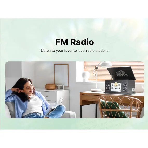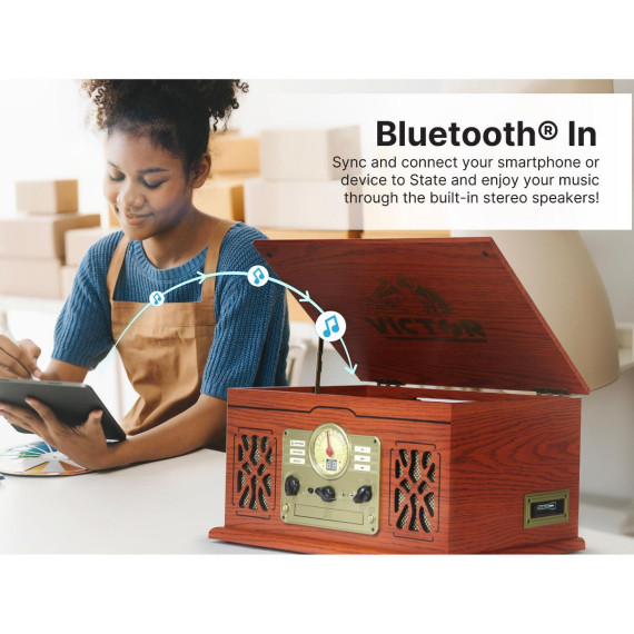 VICTOR State 7-in-1 Turntable Music Center with 3-Speed Record Player, CD/MP3/Cassette Player, FM Radio, Dual Bluetooth In & Out, and Built-in Stereo