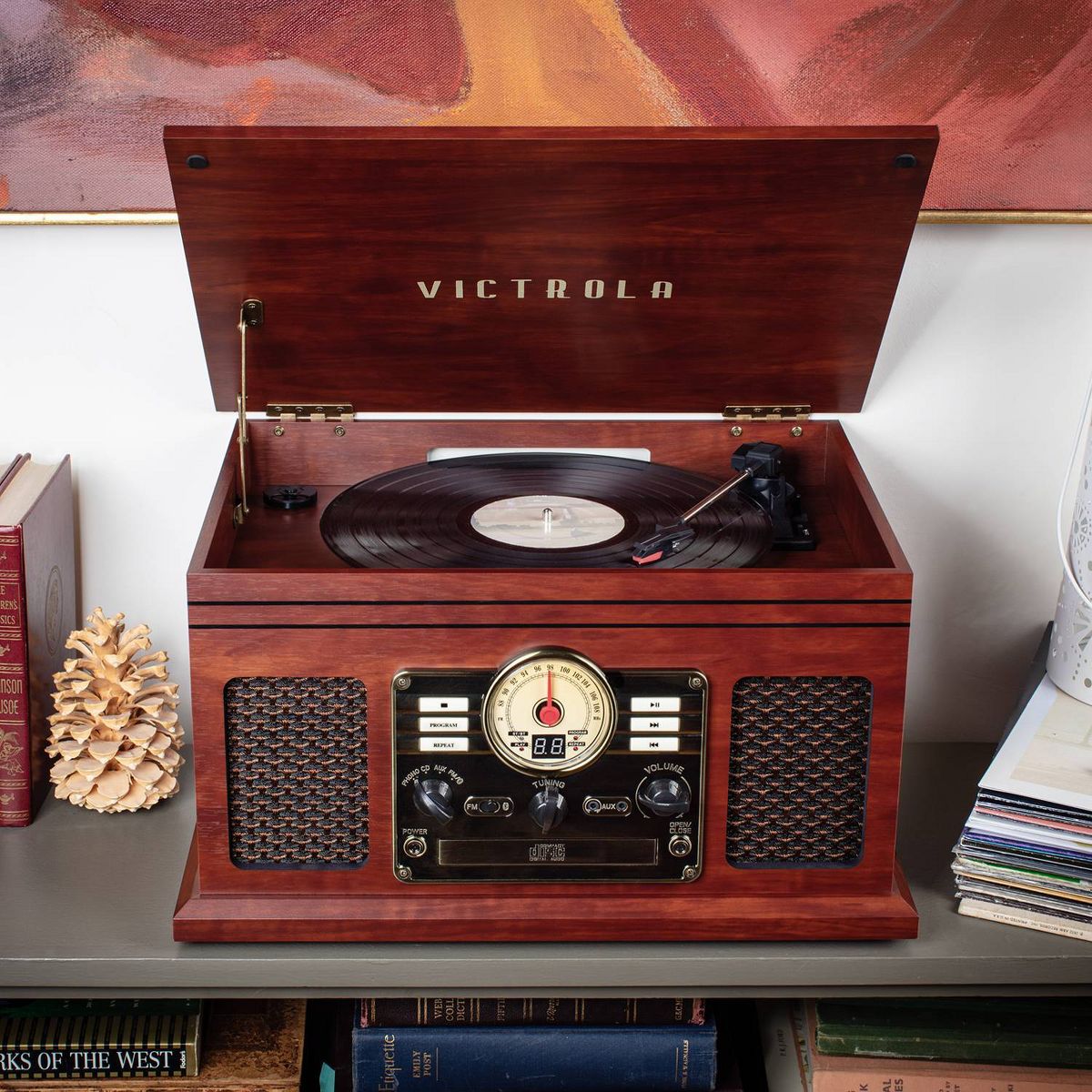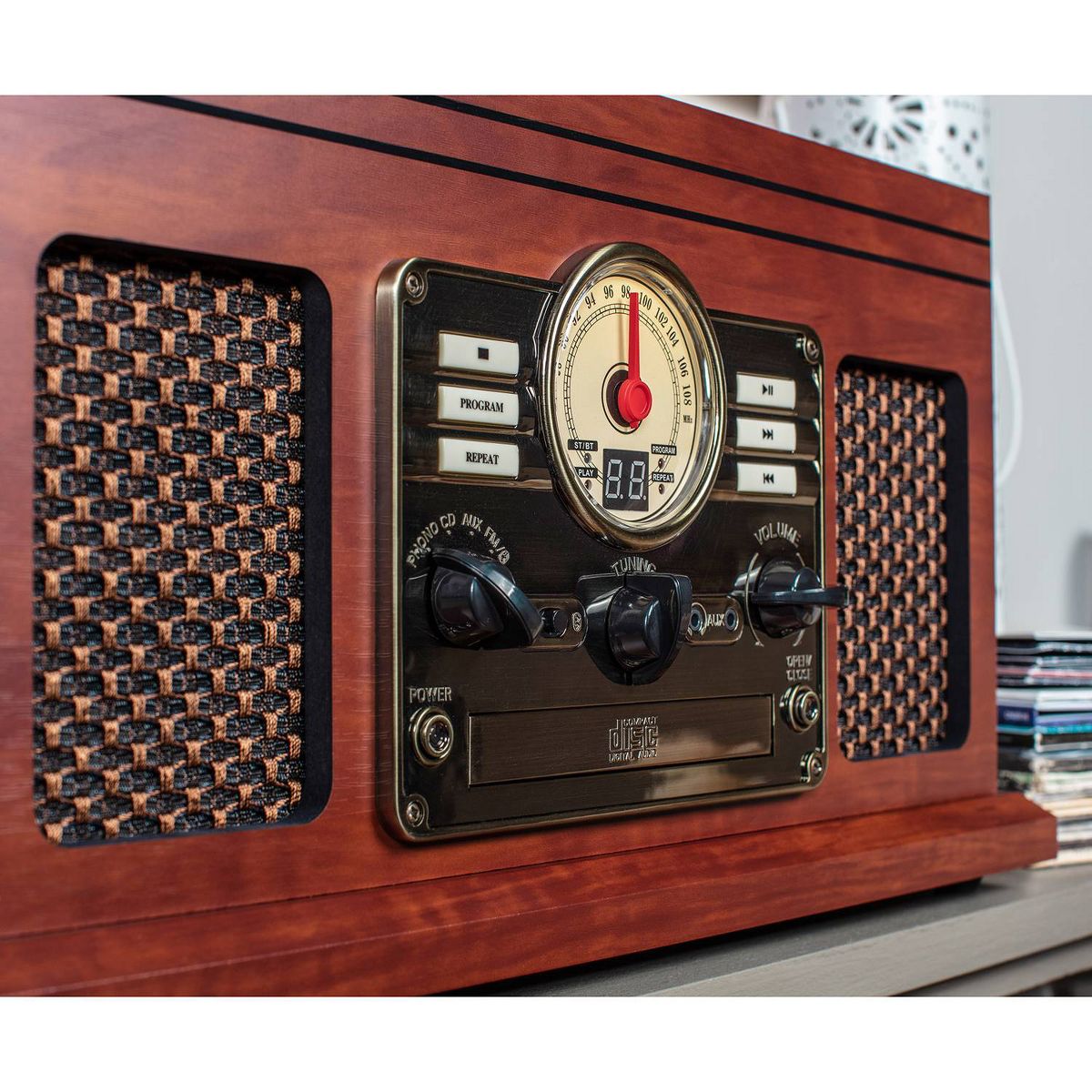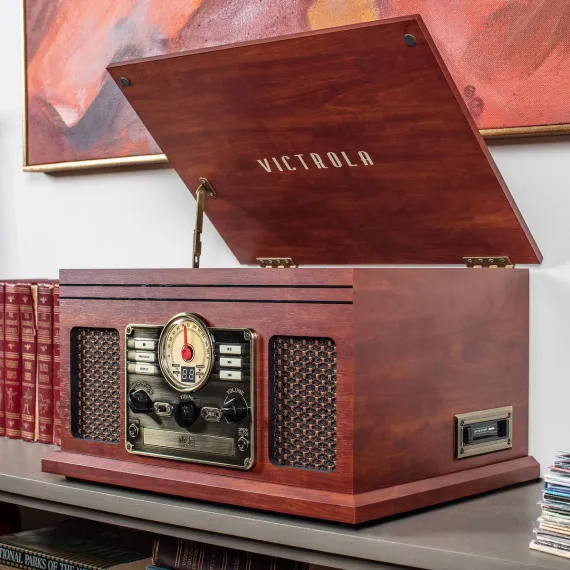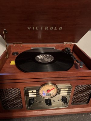 The Victrola Classic Bluetooth Record Player is an all-in-one music powerhouse. The Classic brings vintage style into the modern day, with a nostalgic design and an FM radio with old-school rotary dial. Play all your favorite vinyl records using the 3-speed, belt driven turntable, or stream from your smart device using Bluetooth connectivity. Built-in CD and cassette players allow you to rediscover old favorites, while the stereo speakers deliver powerful sound with pristine clarity at any volume. Antique-style faceplate and smart, wood details make the Classic a perfect fit in any listening space, so you can make lifelong music memories with the tunes you love the most