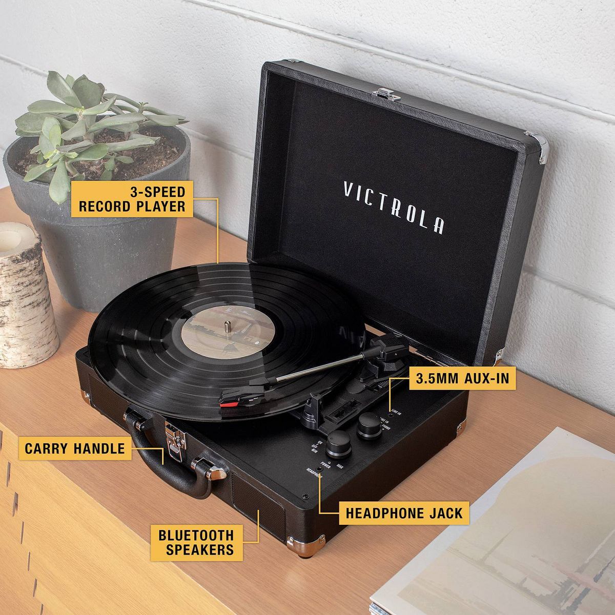 Victrola Journey 3-Speed Bluetooth Suitcase Record Player - Black: Belt Drive, Built-In Speaker