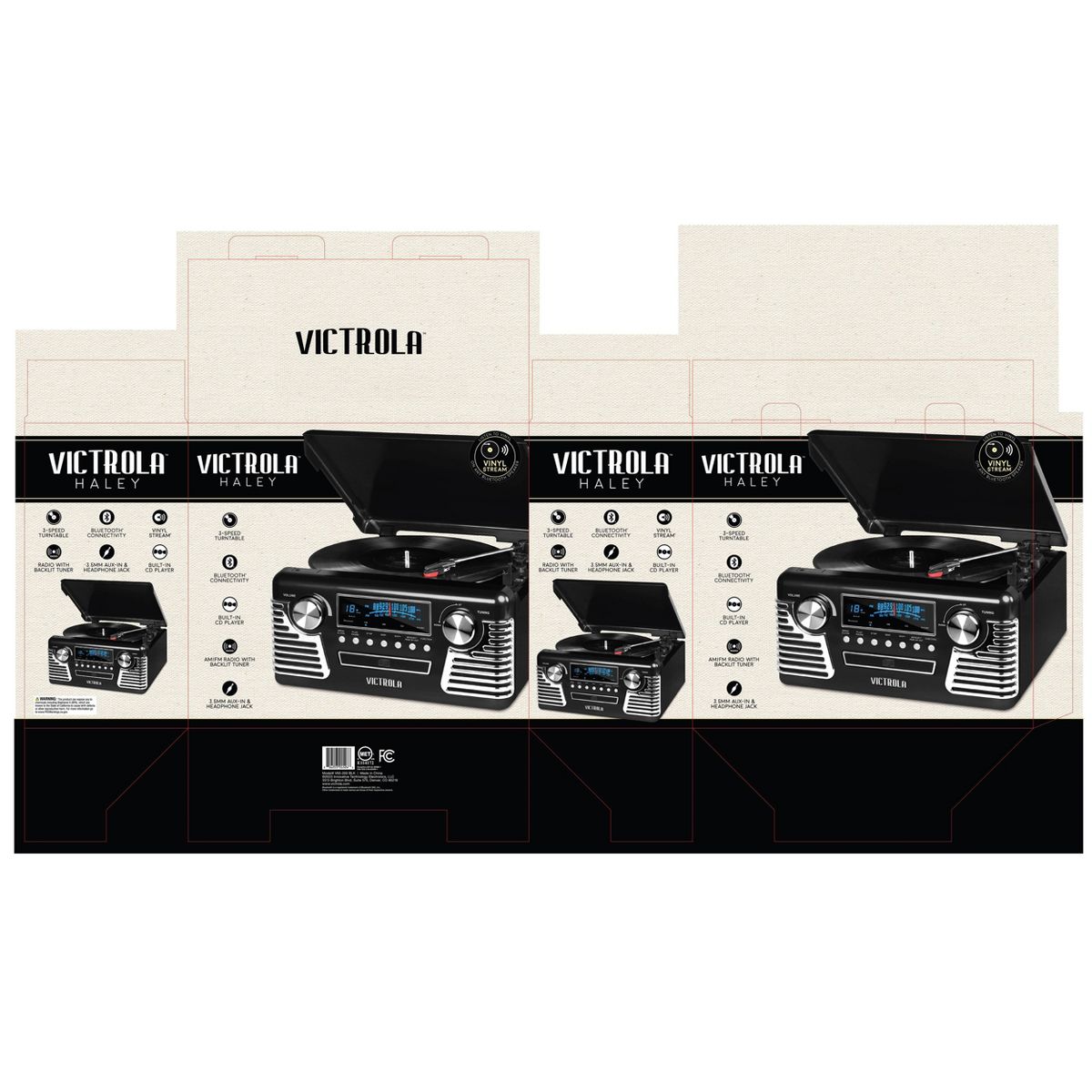 Victrola Retro 3-Speed Bluetooth Record Player - Black: AM/FM Radio, USB Cable