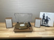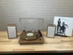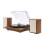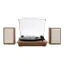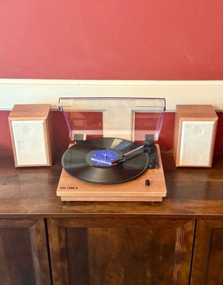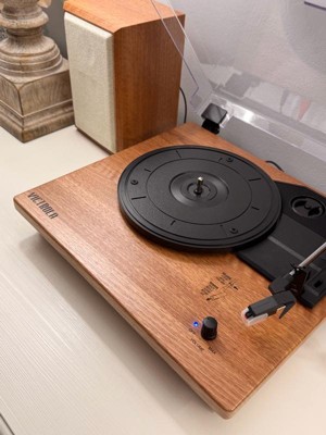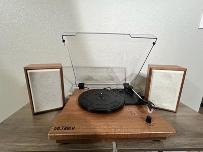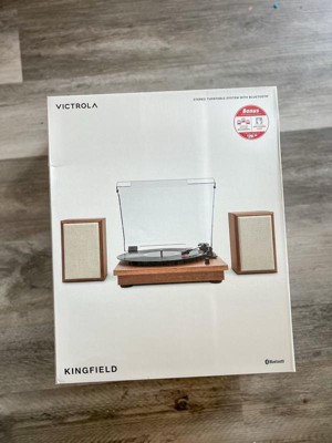 The Victrola Kingfield Bluetooth Turntable is everything you need in a record player shelf system. The Kingfield features a 3-speed, belt driven turntable capable of playing all your favorite vinyl records and easily connects to the included pair of bookshelf speakers through the RCA output for a true stereo listening experience. Stream music from any smart device to the shelf speakers over Bluetooth or connect an external audio device with the 3.5mm aux input.